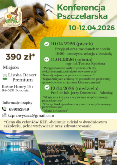 Karpacki Związek Pszczelarzy w Nowym Sączu zaprasza pszczelarzy na wyjątkowe spotkanie pełne wiedzy, praktyki i dobrej atmosfery! – Konferencję Pszczelarską 2026, w dniach 10–12 kwietnia 2026 r.